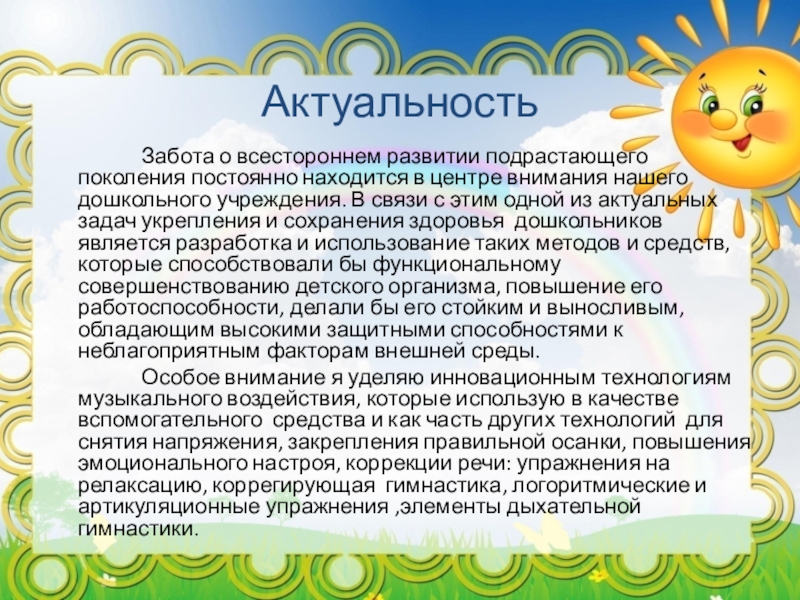Особое внимание я уделяю инновационным технологиям музыкального воздействия, которые использую в качестве вспомогательного средства и как часть других технологий для снятия напряжения, закрепления правильной осанки, повышения эмоционального настроя, коррекции речи: упражнения на релаксацию, коррегирующая гимнастика, логоритмические и артикуляционные упражнения ,элементы дыхательной гимнастики.