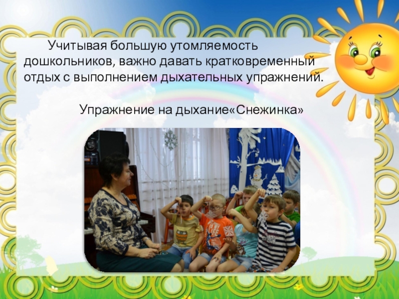 Слайд 13Учитывая большую утомляемость дошкольников, важно давать кратковременный отдых с выполнением дыхательных