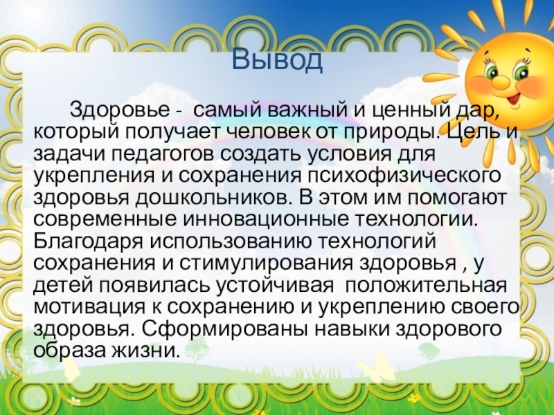который получает человек от природы. Цель и задачи педагогов создать условия для укрепления и сохранения психофизического здоровья дошкольников. В этом им помогают современные инновационные технологии. Благодаря использованию технологий сохранения и стимулирования здоровья , у детей появилась устойчивая положительная мотивация к сохранению и укреплению своего здоровья. Сформированы навыки здорового образа жизни.