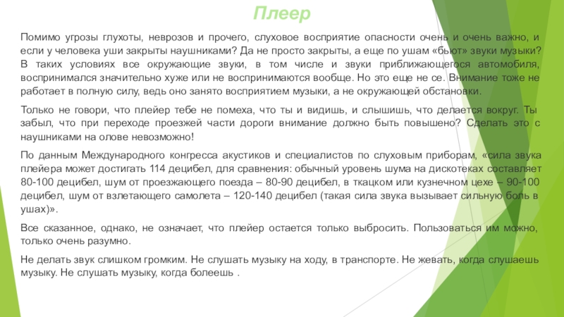 По данным Международного конгресса акустиков и специалистов по слуховым приборам, «сила звука плейера может достигать 114 децибел, для сравнения: обычный уровень шума на дискотеках составляет 80-100 децибел, шум от проезжающего поезда – 80-90 децибел, в ткацком или кузнечном цехе – 90-100 децибел, шум от взлетающего самолета – 120-140 децибел (такая сила звука вызывает сильную боль в ушах)».