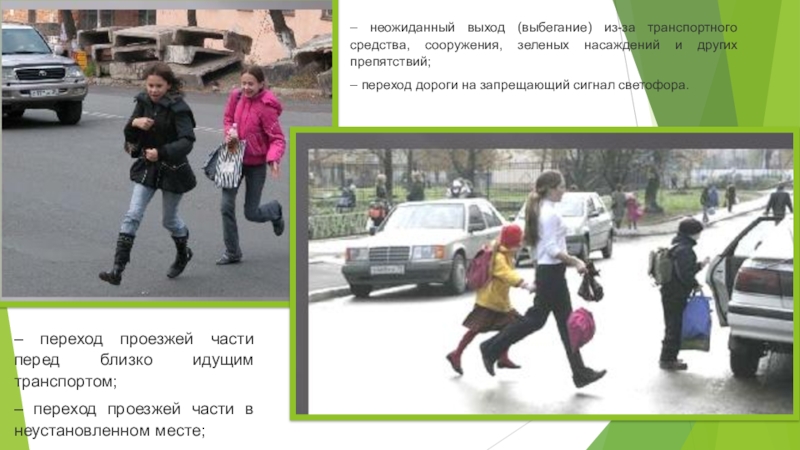 Слайд 6– неожиданный выход (выбегание) из-за транспортного средства, сооружения, зеленых насаждений и
