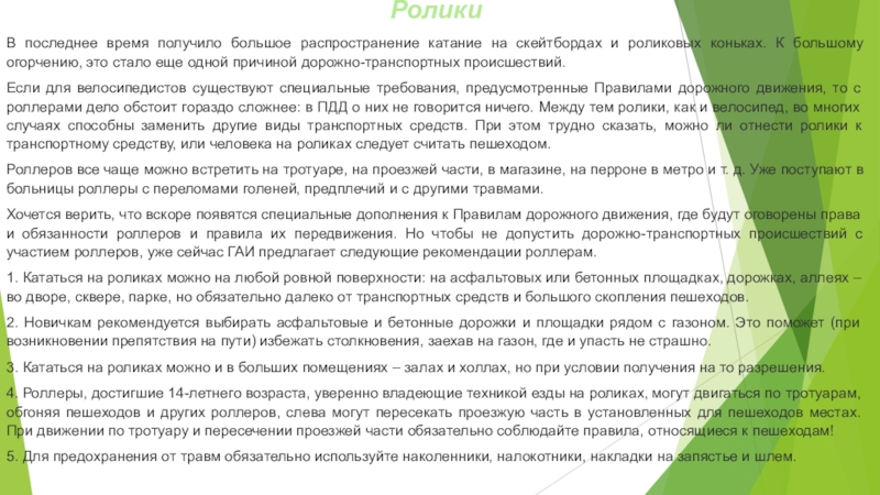 4. Роллеры, достигшие 14-летнего возраста, уверенно владеющие техникой езды на роликах, могут двигаться по тротуарам, обгоняя пешеходов и других роллеров, слева могут пересекать проезжую часть в установленных для пешеходов местах. При движении по тротуару и пересечении проезжей части обязательно соблюдайте правила, относящиеся к пешеходам!