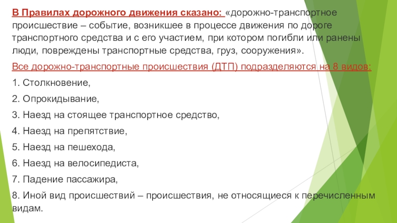 Все дорожно-транспортные происшествия (ДТП) подразделяются на 8 видов:
