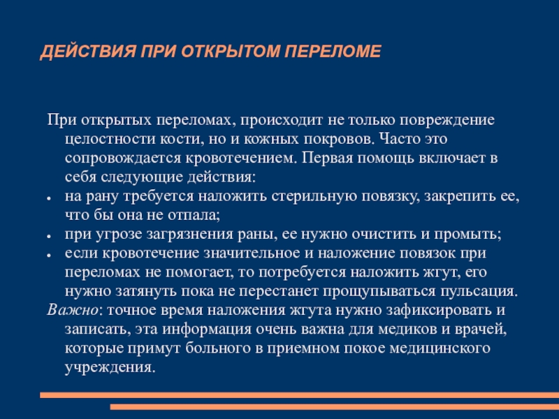 Слайд 14ДЕЙСТВИЯ ПРИ ОТКРЫТОМ ПЕРЕЛОМЕ
