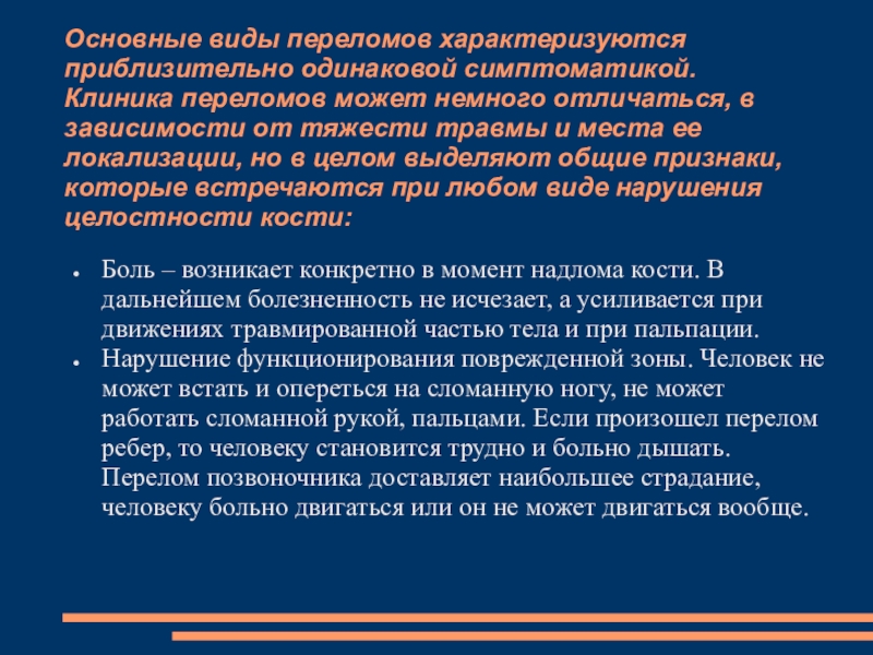 Слайд 8Основные виды переломов характеризуются приблизительно одинаковой симптоматикой. Клиника переломов может немного