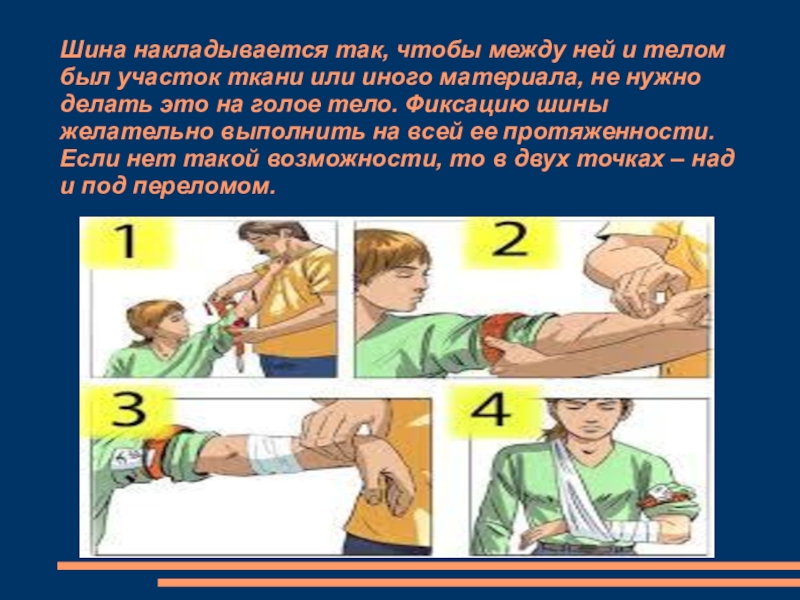 Слайд 18Шина накладывается так, чтобы между ней и телом был участок ткани