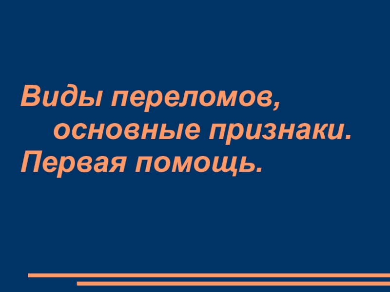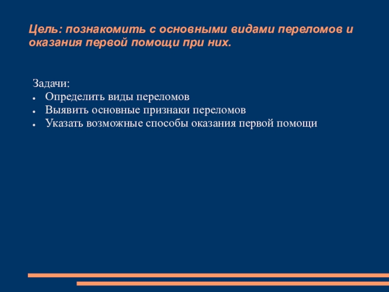 Слайд 2Цель: познакомить с основными видами переломов и оказания первой помощи при