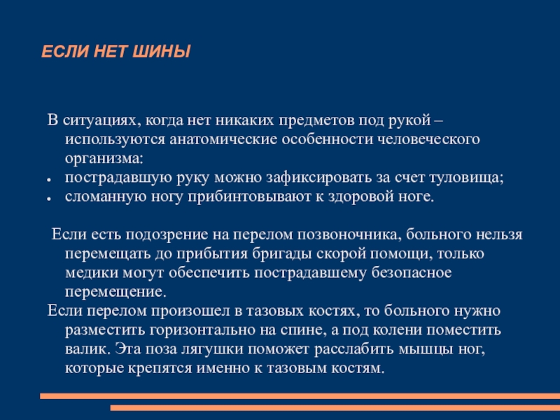 или иного материала, не нужно делать это на голое тело. Фиксацию шины желательно выполнить на всей ее протяженности. Если нет такой возможности, то в двух точках – над и под переломом.