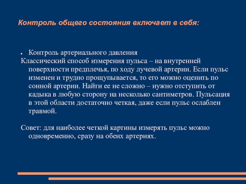 – на внутренней поверхности предплечья, по ходу лучевой артерии. Если пульс изменен и трудно прощупывается, то его можно оценить по сонной артерии. Найти ее не сложно – нужно отступить от кадыка в любую сторону на несколько сантиметров. Пульсация в этой области достаточно четкая, даже если пульс ослаблен травмой.