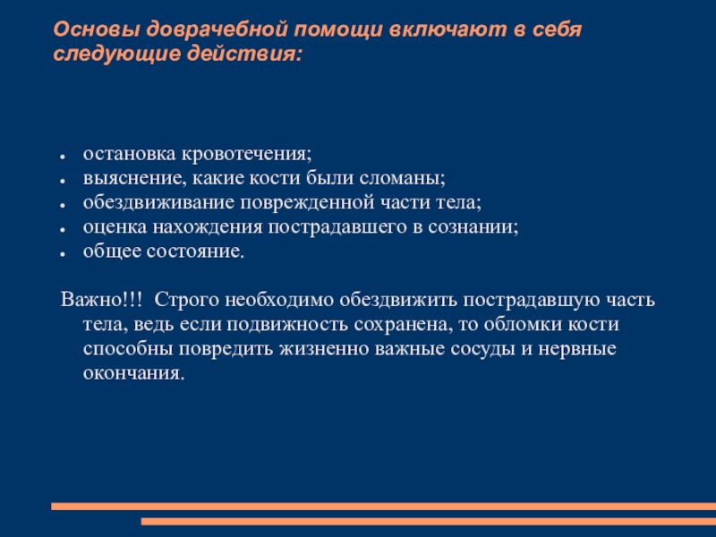 Слайд 20Важно: нельзя пытаться вправить сломанную кость, это может усугубить шок, спровоцировать