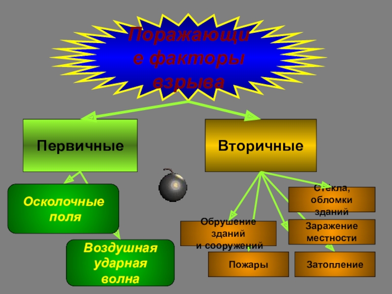 Осколки, разлетающиеся при взрыве, вызывают поражение людей, техники и повреждение элементов строений (зданий) в зависимости от мощности взрыва, вида подрыва ВОП, наличия осколков в составе ВОП, рельефа местности, а также ряда других факторов.