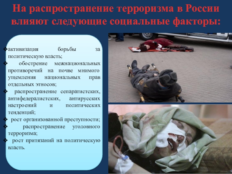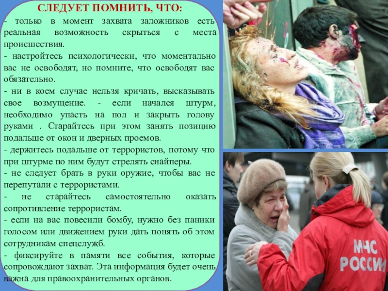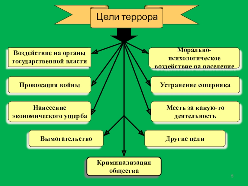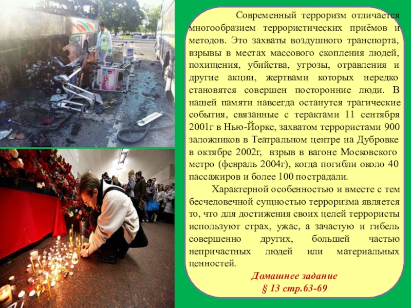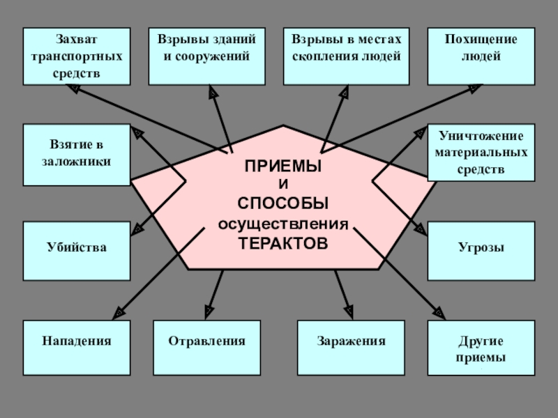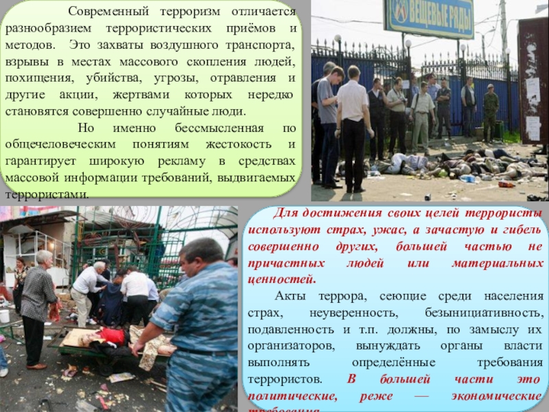 Для достижения своих целей террористы используют страх, ужас, а зачастую и гибель совершенно других, большей частью не причастных людей или материальных ценностей.