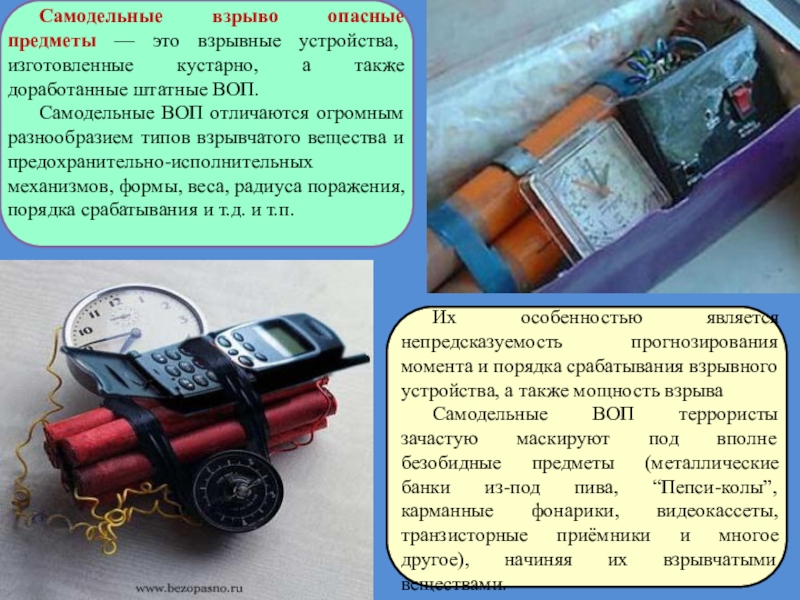 Самодельные ВОП террористы зачастую маскируют под вполне безобидные предметы (металлические банки из-под пива, “Пепси-колы”, карманные фонарики, видеокассеты, транзисторные приёмники и многое другое), начиняя их взрывчатыми веществами.