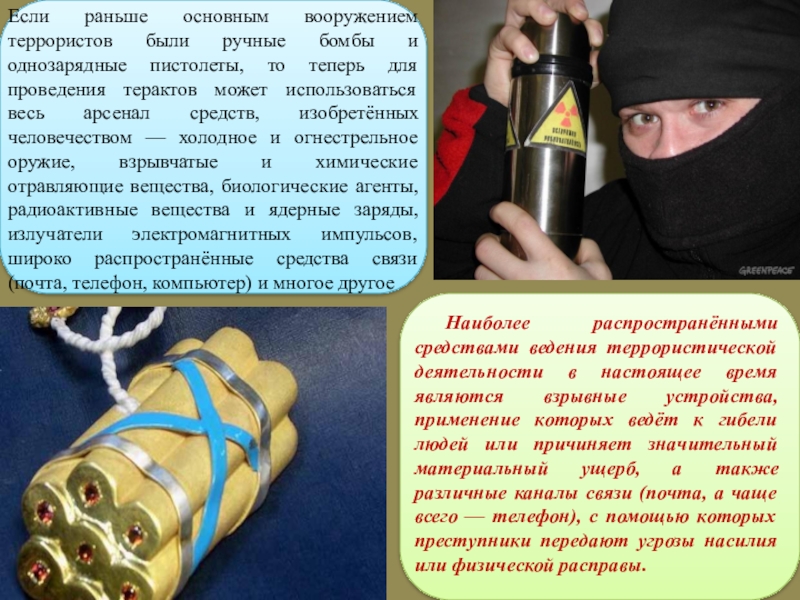 Наиболее распространёнными средствами ведения террористической деятельности в настоящее время являются взрывные устройства, применение которых ведёт к гибели людей или причиняет значительный материальный ущерб, а также различные каналы связи (почта, а чаще всего — телефон), с помощью которых преступники передают угрозы насилия или физической расправы.