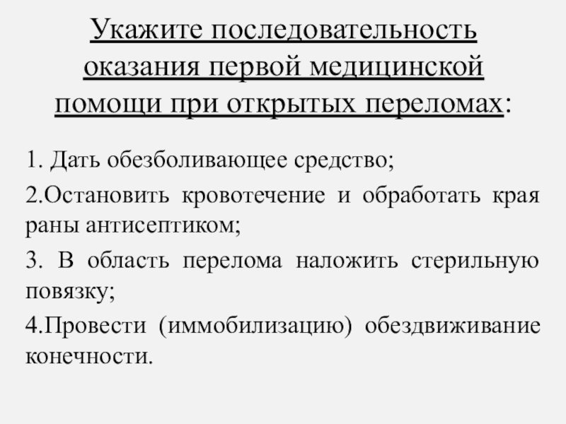 Слайд 69Укажите последовательность оказания первой медицинской помощи при открытых переломах: