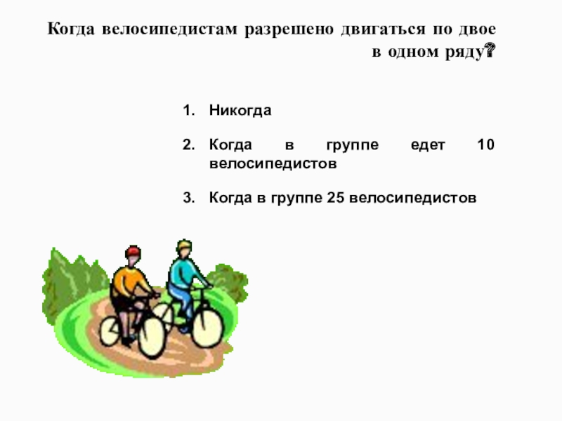 Слайд 72Когда велосипедистам разрешено двигаться по двое в одном ряду?