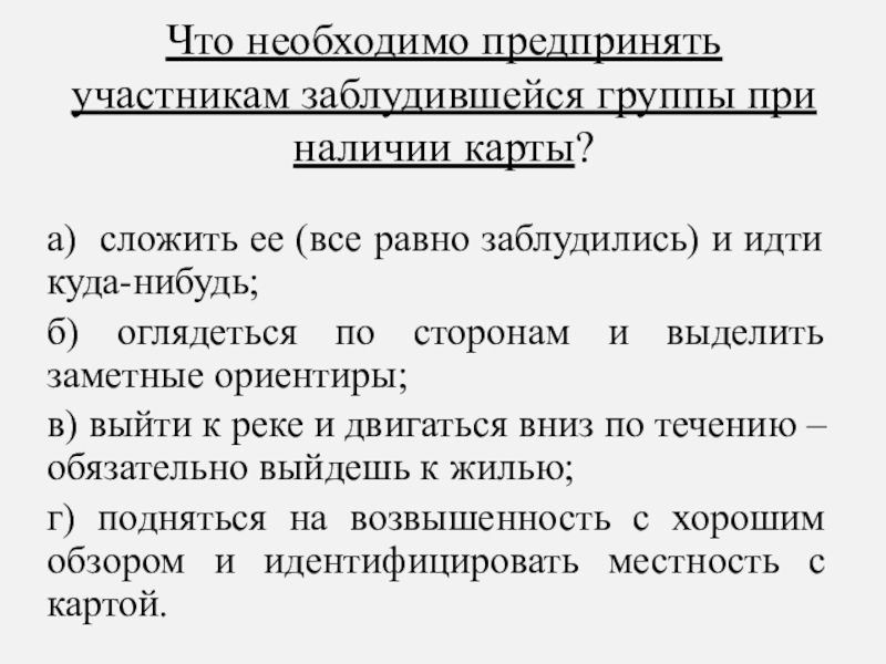 Слайд 46Что необходимо предпринять участникам заблудившейся группы при наличии карты?