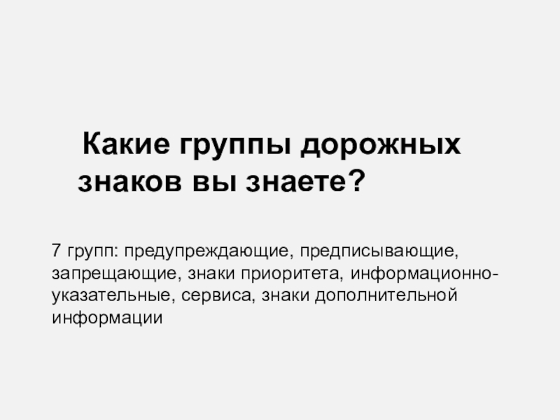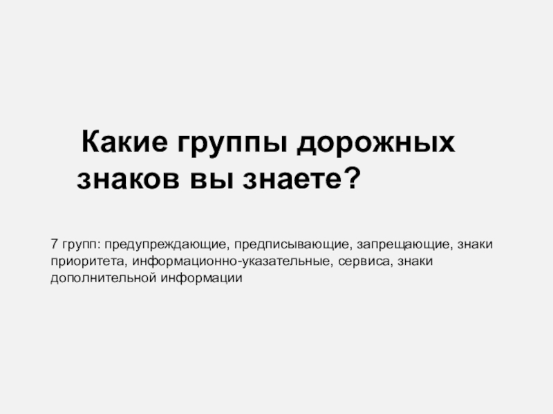 Слайд 33 Какие группы дорожных знаков вы знаете?