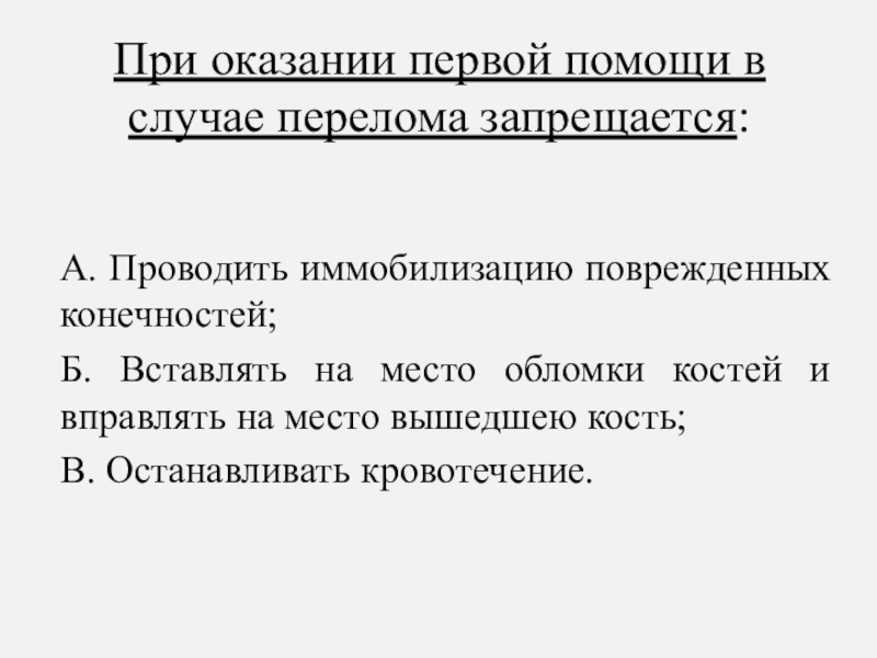Слайд 87При оказании первой помощи в случае перелома запрещается: