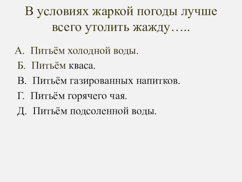 Слайд 27В условиях жаркой погоды лучше всего утолить жажду…..