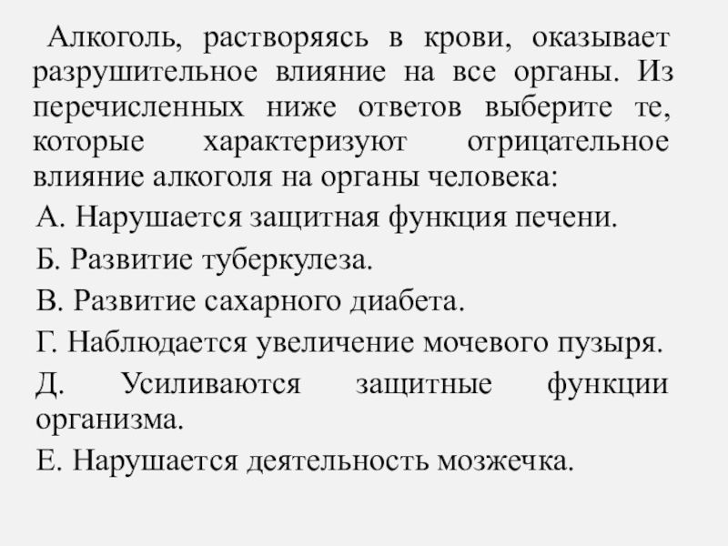 Из перечисленных ниже ответов выберите те, которые характеризуют отрицательное влияние алкоголя на органы человека: