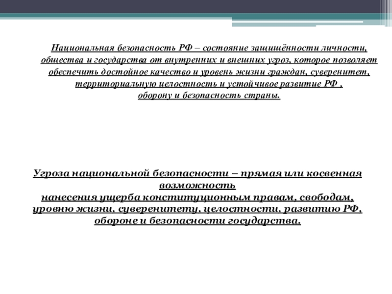 нанесения ущерба конституционным правам, свободам, уровню жизни, суверенитету, целостности, развитию РФ, обороне и безопасности государства.