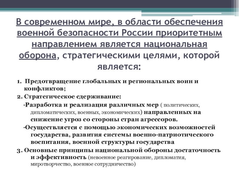 3. Основные принципы национальной обороны достаточность и эффективность (невоенное реагирование, дипломатия, миротворчество, военное сотрудничество)
