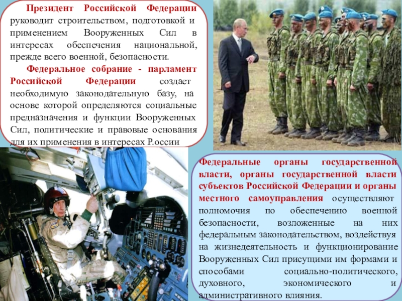 Так, разработка и принятие основополагающих нормативных актов в области обороны, военной политики были и остаются прерогативой высшего государственного руководства. Верховным Главнокомандующим Вооруженных Сил страны является Президент России.