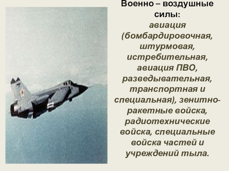 Слайд 10Военно – воздушные силы: