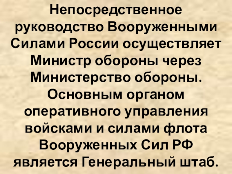 Слайд 6Непосредственное руководство Вооруженными Силами России осуществляет Министр обороны через Министерство обороны.