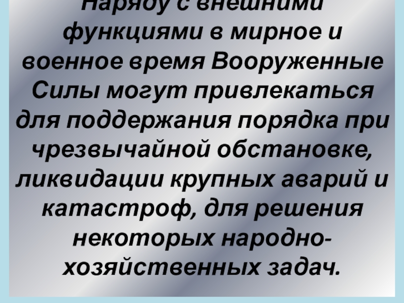 Слайд 4Наряду с внешними функциями в мирное и военное время Вооруженные Силы