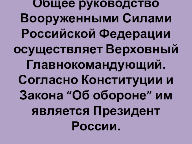 Слайд 5Общее руководство Вооруженными Силами Российской Федерации осуществляет Верховный Главнокомандующий. Согласно Конституции