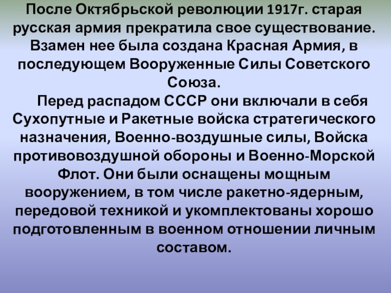 Слайд 15После Октябрьской революции 1917г. старая русская армия прекратила свое существование. Взамен