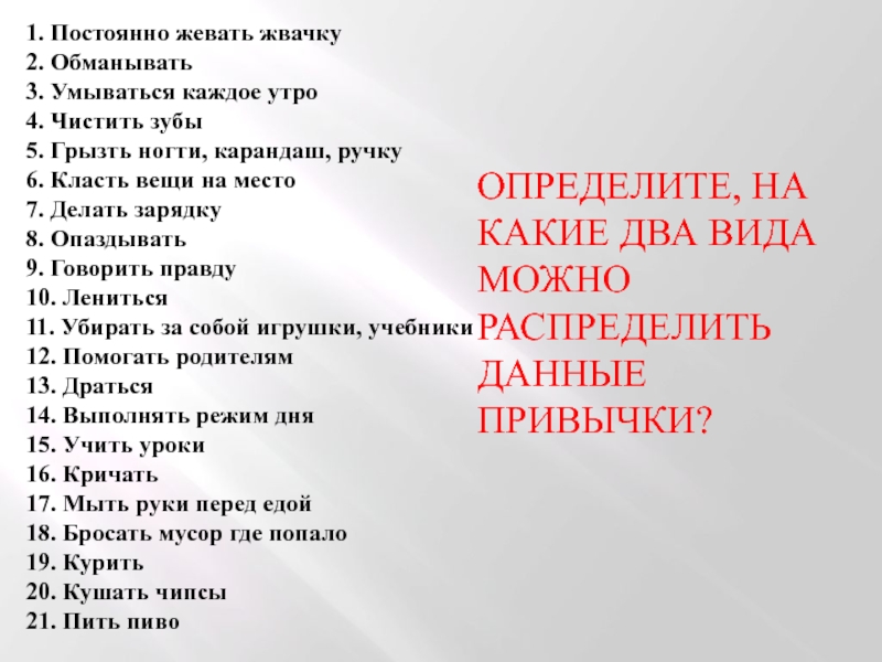 ОПРЕДЕЛИТЕ, НА КАКИЕ ДВА ВИДА МОЖНО РАСПРЕДЕЛИТЬ ДАННЫЕ ПРИВЫЧКИ?