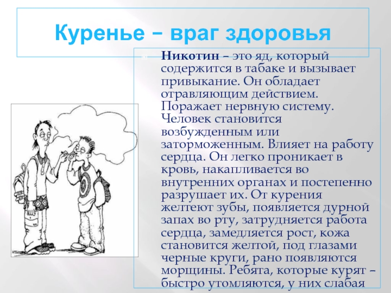 табаке и вызывает привыкание. Он обладает отравляющим действием. Поражает нервную систему. Человек становится возбужденным или заторможенным. Влияет на работу сердца. Он легко проникает в кровь, накапливается во внутренних органах и постепенно разрушает их. От курения желтеют зубы, появляется дурной запах во рту, затрудняется работа сердца, замедляется рост, кожа становится желтой, под глазами черные круги, рано появляются морщины. Ребята, которые курят – быстро утомляются, у них слабая память, плохое внимание. Курильщика ждут болезни органов дыхания: астма, туберкулёз.