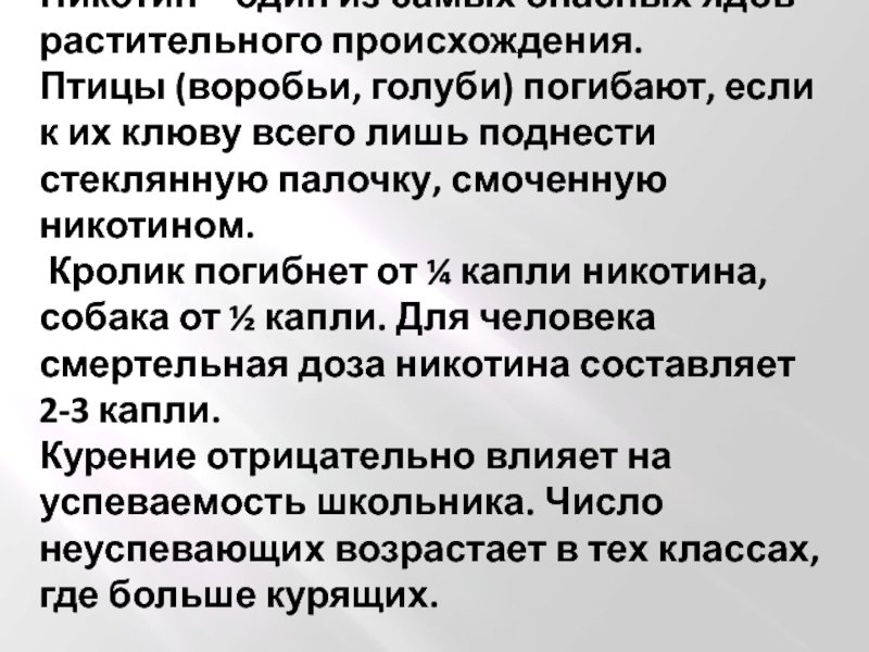 голуби) погибают, если к их клюву всего лишь поднести стеклянную палочку, смоченную никотином.