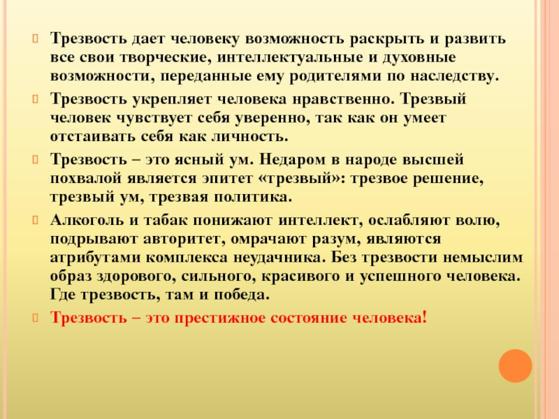 Слайд 10Трезвость дает человеку возможность раскрыть и развить все свои творческие, интеллектуальные