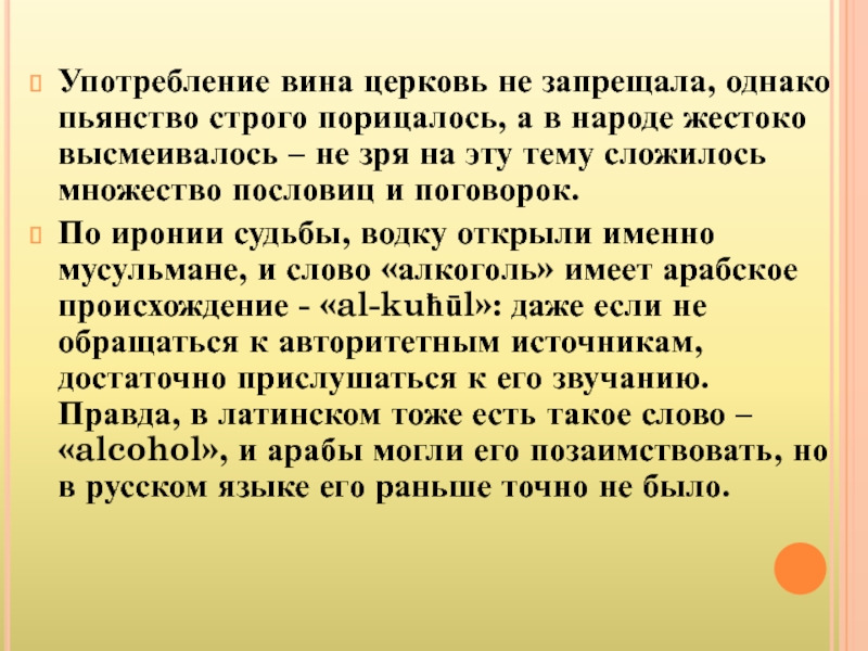 Слайд 7Употребление вина церковь не запрещала, однако пьянство строго порицалось, а в