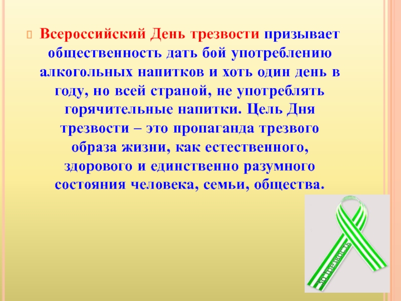Слайд 8Всероссийский День трезвости призывает общественность дать бой употреблению алкогольных напитков и