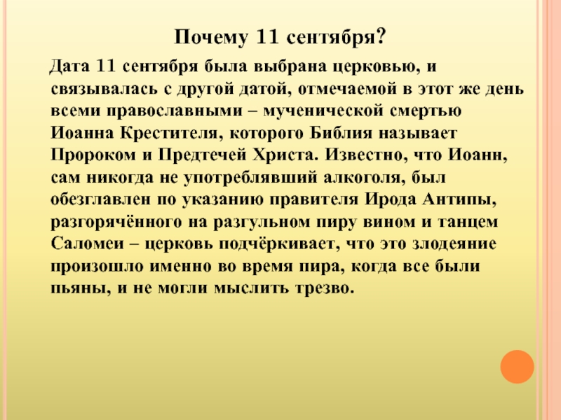 связывалась с другой датой, отмечаемой в этот же день всеми православными – мученической смертью Иоанна Крестителя, которого Библия называет Пророком и Предтечей Христа. Известно, что Иоанн, сам никогда не употреблявший алкоголя, был обезглавлен по указанию правителя Ирода Антипы, разгорячённого на разгульном пиру вином и танцем Саломеи – церковь подчёркивает, что это злодеяние произошло именно во время пира, когда все были пьяны, и не могли мыслить трезво.