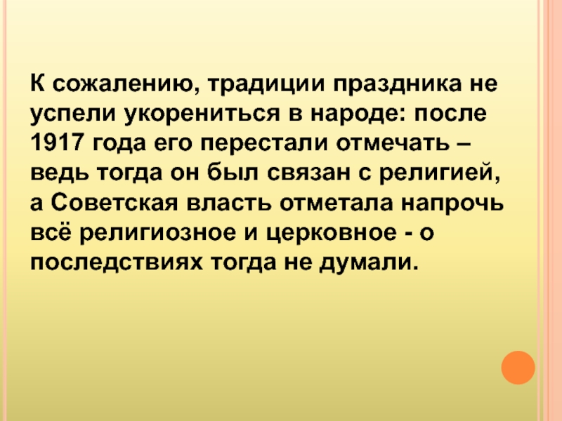 Слайд 5К сожалению, традиции праздника не успели укорениться в народе: после 1917