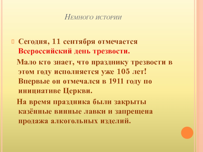 что празднику трезвости в этом году исполняется уже 105 лет! Впервые он отмечался в 1911 году по инициативе Церкви.