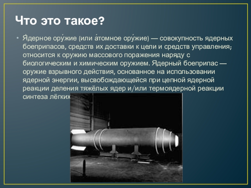 средств их доставки к цели и средств управления; относится к оружию массового поражения наряду с биологическим и химическим оружием. Ядерный боеприпас — оружие взрывного действия, основанное на использовании ядерной энергии, высвобождающейся при цепной ядерной реакции деления тяжёлых ядер и/или термоядерной реакции синтеза лёгких ядер.