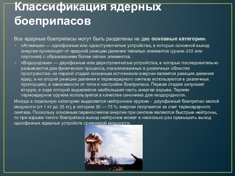 Все ядерные боеприпасы могут быть разделены на две основные категории: