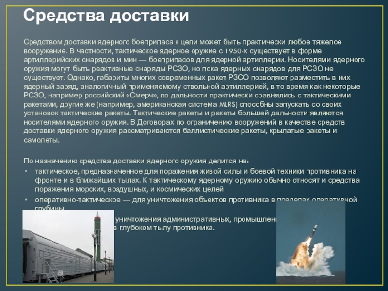тяжелое вооружение. В частности, тактическое ядерное оружие с 1950-х существует в форме артиллерийских снарядов и мин — боеприпасов для ядерной артиллерии. Носителями ядерного оружия могут быть реактивные снаряды РСЗО, но пока ядерных снарядов для РСЗО не существует. Однако, габариты многих современных ракет РЗСО позволяют разместить в них ядерный заряд, аналогичный применяемому ствольной артиллерией, в то время как некоторые РСЗО, например российский «Смерч», по дальности практически сравнялись с тактическими ракетами, другие же (например, американская система MLRS) способны запускать со своих установок тактические ракеты. Тактические ракеты и ракеты большей дальности являются носителями ядерного оружия. В Договорах по ограничению вооружений в качестве средств доставки ядерного оружия рассматриваются баллистические ракеты, крылатые ракеты и самолеты.