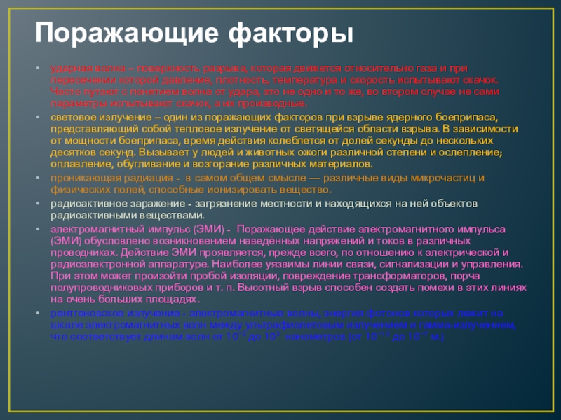 электромагнитный импульс (ЭМИ) - Поражающее действие электромагнитного импульса (ЭМИ) обусловлено возникновением наведённых напряжений и токов в различных проводниках. Действие ЭМИ проявляется, прежде всего, по отношению к электрической и радиоэлектронной аппаратуре. Наиболее уязвимы линии связи, сигнализации и управления. При этом может произойти пробой изоляции, повреждение трансформаторов, порча полупроводниковых приборов и т. п. Высотный взрыв способен создать помехи в этих линиях на очень больших площадях.