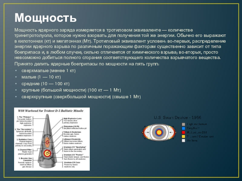 нужно взорвать для получения той же энергии. Обычно его выражают в килотоннах (кт) и мегатоннах (Мт). Тротиловый эквивалент условен: во-первых, распределение энергии ядерного взрыва по различным поражающим факторам существенно зависит от типа боеприпаса и, в любом случае, сильно отличается от химического взрыва; во-вторых, просто невозможно добиться полного сгорания соответствующего количества взрывчатого вещества.