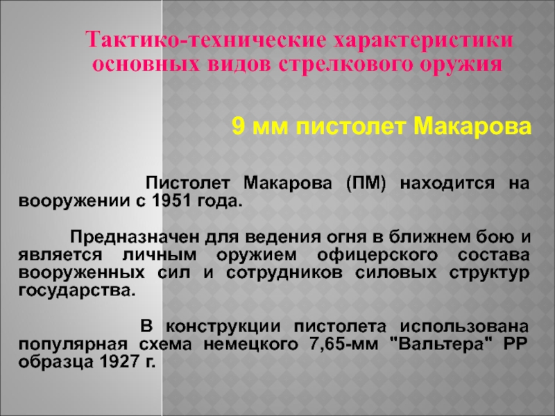Вмещает в себя 17 патронов калибра 9-мм, неплохо выглядит и является достойным приемником пистолета Макарова.