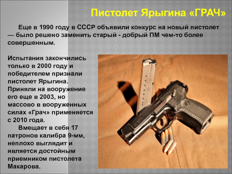 Испытания закончились только в 2000 году и победителем признали пистолет Ярыгина. Приняли на вооружение его еще в 2003, но массово в вооруженных силах «Грач» применяется с 2010 года.