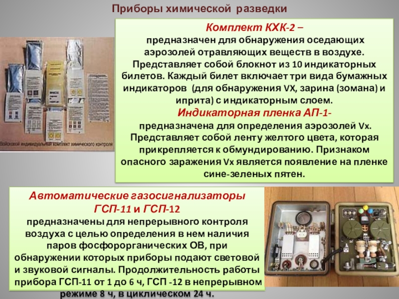 предназначены для непрерывного контроля воздуха с целью определения в нем наличия паров фосфорорганических ОВ, при обнаружении которых приборы подают световой и звуковой сигналы. Продолжительность работы прибора ГСП-11 от 1 до 6 ч, ГСП -12 в непрерывном режиме 8 ч, в циклическом 24 ч.